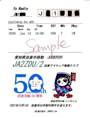岩倉市は来年の市制50周年に向けての機運を盛り上げるために,市制50周年ロゴを作りました。当クラブとしても,市制50周年に向けてのPRということで,クラブのqslカードにこのロゴを載せることにしました。また,岩倉市のPR大使の「い~わくん」も載せて,ダブルでPRに協力していきます。