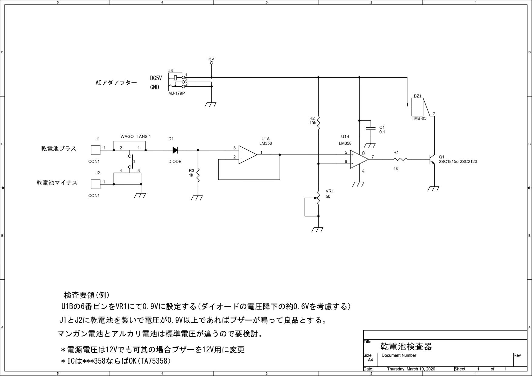 回路は,オペアンプを使ったコンパレータ(2つの電圧を比較して,どちらが大きいかで出力を切り替える)だそうです。1.2Vで切り替わるようにVRを合わせておきます。1.2Vあれば,ブザーが鳴るという仕組みです。