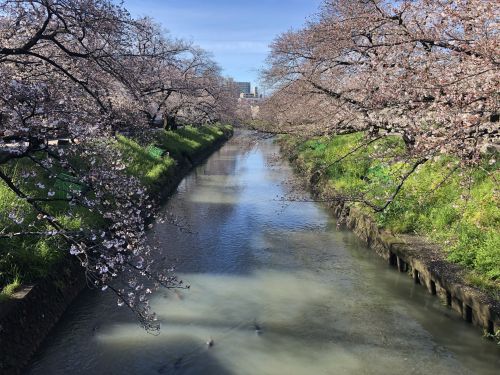 川面は,早くも桜の花びらが流れ,花筏の様相。今年の桜もフィナーレを迎えます。